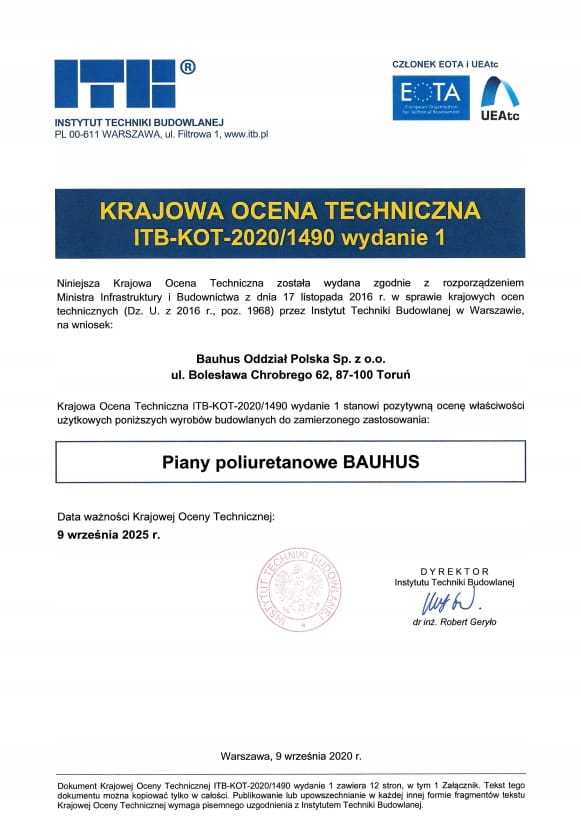 Nasza piana posiada certyfikat - Krajową Ocenę Techniczną wydaną przez Instytut Techniki Budowlanej - dopuszczającą do między innymi montażu drzwi i okien. Dzięki temu jest dopuszczona do montażu, co pozwoli uniknąć problemów w odbiorze budynku oraz w razie reklamacji.