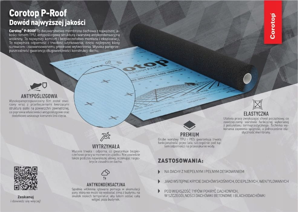 FOLIA MEMBRANA DACHOWA TPU COROTOP P-ROOF 215g / 75 m2 MEGA WYTRZYMAŁA Marka Corotop