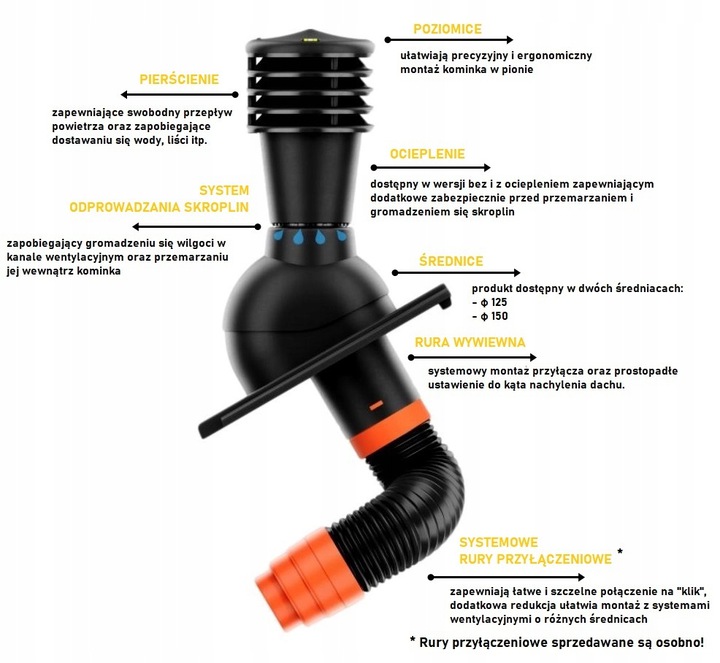 Kominek Wentylacyjny - wersja tradycyjna modelu, średnica 150 pozwala na bardziej wydajny przepływ powietrza, zapewniając tym samym podwyższoną sprawność wentylacji. Konstrukcja kominka wyposażona jest w 4 pierścienie, gwarantujące optymalną cyrkulację nawiewu.