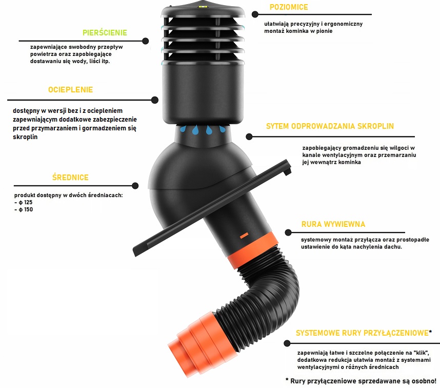 Kominek Wentylacyjny SmartLine - jest usprawnioną wersją tradycyjnego modelu, wzbogaconą o odpływ kondensatu, poziomice ułatwiające montaż oraz zapewniającą pionowe przejście przez połać dachową. Standardowa średnica systemu DN110 została zastąpiona przekrojem DN125, pozwalającym na bardziej wydajny przepływ powietrza, zapewniając tym samym podwyższoną sprawność wentylacji. Konstrukcja kominka wyposażona jest w 4 pierścienie, gwarantujące optymalną cyrkulację nawiewu.