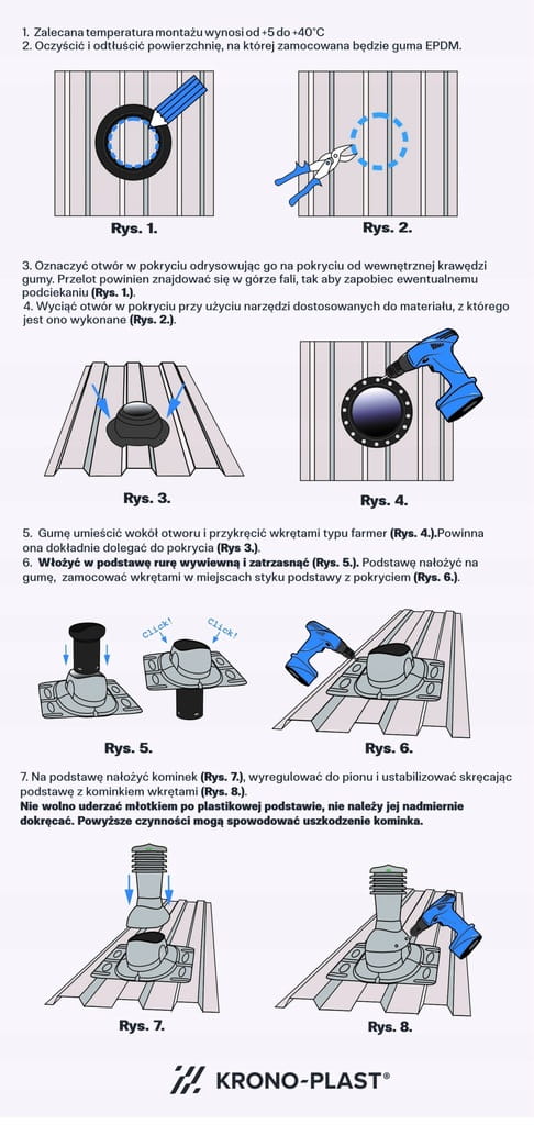 - Rura wywiewna - systemowy montaż przyłącza oraz prostopadłe ustawienie do kąta nachylenia dachu.