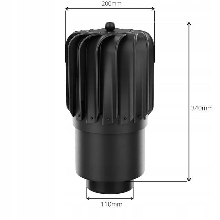 - Turbiny z tworzywa PP na łożysku kulkowym INOX zalanym najwyższej jakości olejem, zakończonej otworem fi 150 z redukcją fi 110 do zakończenia kanałów wentylacyjnych