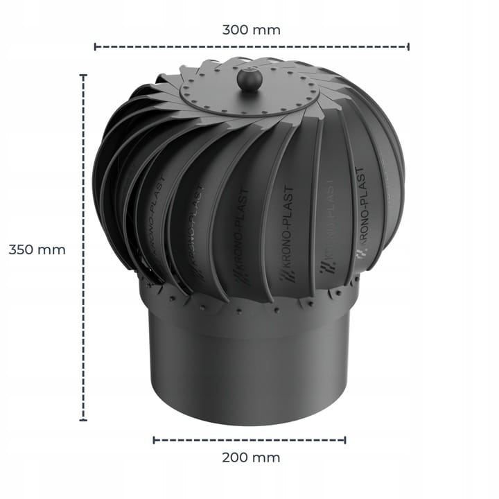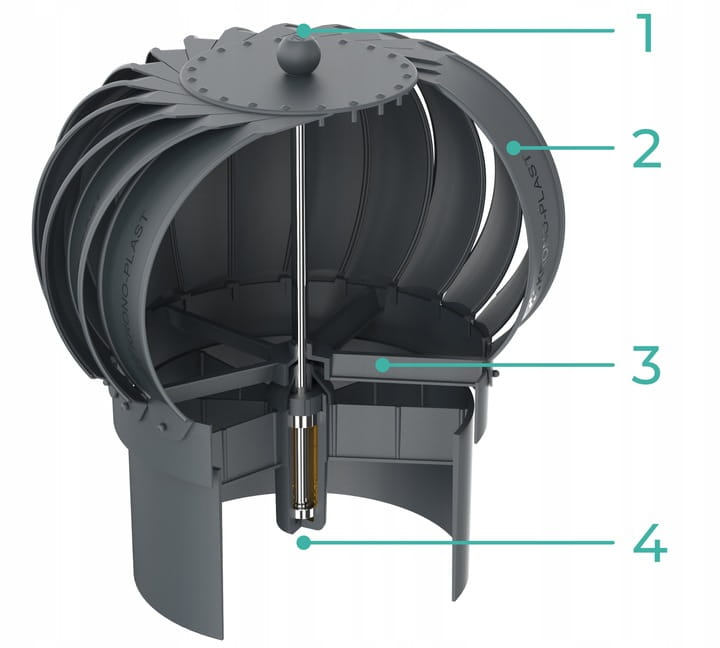 - Turbiny z tworzywa PP na łożysku kulkowym INOX zalanym najwyższej jakości olejem, zakończonej otworem fi 200 do zakończenia kanałów wentylacyjnych