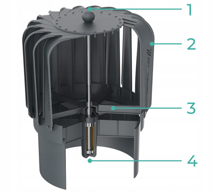 - Turbiny z tworzywa PP na łożysku kulkowym INOX zalanym najwyższej jakości olejem, zakończonej otworem fi 150 do zakończenia kanałów wentylacyjnych
