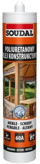 Poliuretanowy klej konstrukcyjny 60 A firmy Soudal to klej w paście, charakteryzujący się ekstremalnie mocnym spojeniem oraz bardzo wysoką wodoodpornością. Jest szybkoschnący i doskonale przyczepny do większości materiałów budowlanych, również wilgotnych, dzięki czemu doskonale sprawdzi się przy wszelkiego typu pracach stolarskich oraz ciesielskich również na zewnątrz budynku. Klej konstrukcyjny 60 A jest powszechnie stosowany do klejenia stolarki drzwiowej i okiennej, montażu elementów dekoracyjnych do m.in. betonu, cegły, drewna, a także do klejenia elementów architektury ogrodowej, mebli, stopni schodów i parapetów.