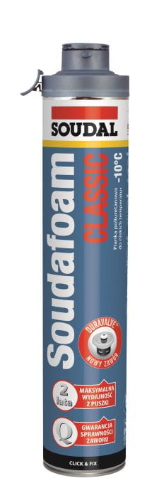 Soudafoam CLASSIC wysokiej jakości pistoletowa piana montażowo-uszczelniająca o doskonałej przyczepności do większości materiałów budowlanych. Formuła "zimowa" umożliwia pracę w niskich temperaturach do -10°C. Opatentowane bagnetowe złącze CLICK zapewnia błyskawiczne i pewne mocowanie puszki w teflonowym gnieździe pistoletu już po przekręceniu o ¼ obrotu.