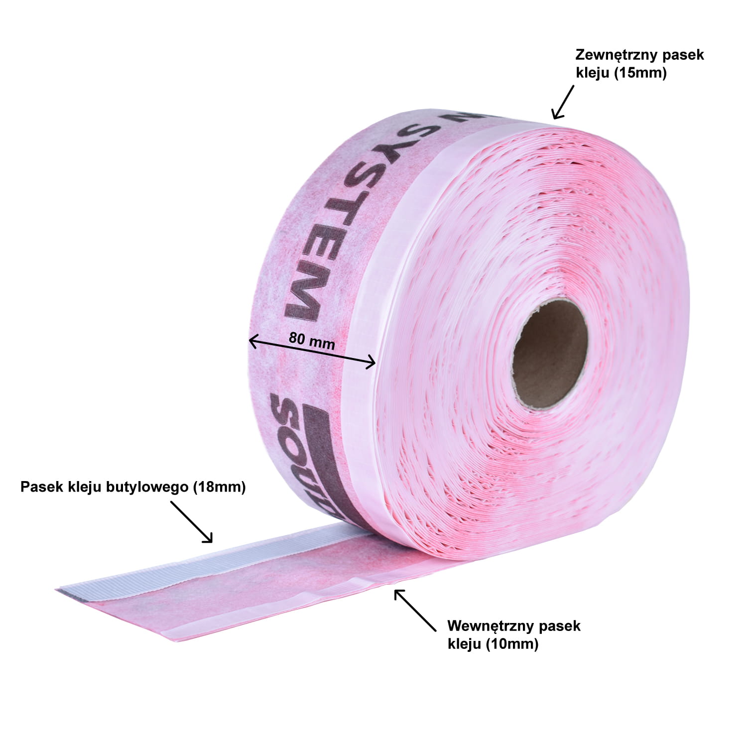 Taśma paroszczelna (czerwona) chroni warstwę piany poliuretanowej przed przenikaniem do niej pary wodnej i wilgoci z wnętrza budynku. Zdjąć białą osłonkę zabezpieczającą i przykleić taśmę do zagruntowanego i suchego ościeża. Pasek butylu docisnąć gumowym wałkiem, aby zapewnić szczelne połączenie taśmy z murem. Po wyklejeniu taśma powinna przylegać do podłoża na całej szerokości. Miejsca łączenia taśm i wystających łączników mechanicznych doszczelnić klejem Vapourseal