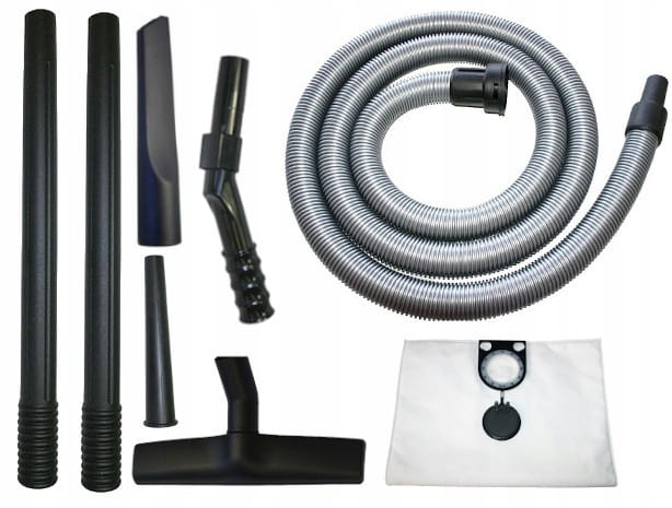 - Odkurzacz budowlany / rzemieślniczy: odkurzacz z plastikowymi akcesoriami i podstawowym wyposażeniem
