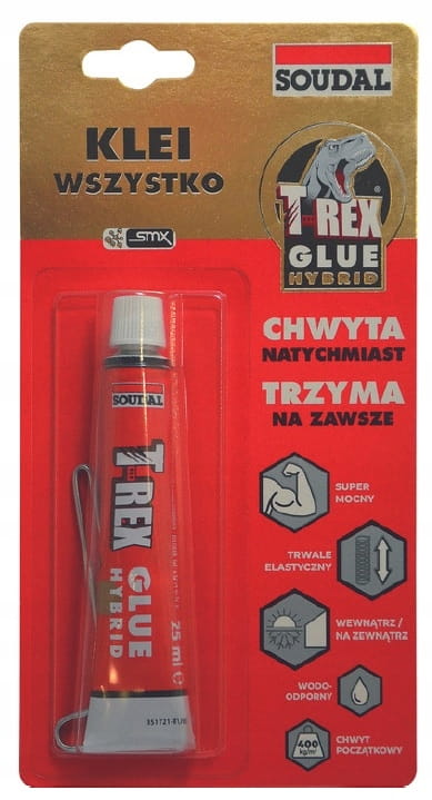T-REX HYBRYDOWY to wzmocniony włóknami syntetycznymi trwale elastyczny klej montażowy o ekstremalnie wysokiej sile spojenia początkowego (do 400 kg/m2 już w 1 sek. od dociśnięcia) i wyjątkowo mocnym wiązaniu. Nie zawiera rozpuszczalników i silikonów – praktycznie bezwonny i bezpieczny dla wszelkich materiałów konstrukcyjnych i dekoracyjnych. Odpowiedni zarówno do podłoży porowatych, jak i nieporowatych: drewna, sklejki, MDF, OSB, wielu tworzyw sztucznych, cegły, kamienia, metali, szkła i ceramiki itp. Wypełnia niewielkie nierówności podłoża. Spoina daje się malować nawet farbami wodnymi. Odporny na szeroki zakres temperatur, niewrażliwy na skrajne warunki atmosferyczny, wodoodporny i wodoszczelny - może być stosowany nawet na wilgotnych podłożach. Specjalnie wyprofilowana dysza ułatwia wyciskanie i uzyskanie odpowiedniego kształtu spoiny.