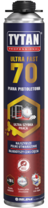 Piana pistoletowa Tytan Professional ULTRA FAST 70 charakteryzuje się wysoką wydajnością do 77 litrów oraz niską post-ekspansją. Nowoczesna formuła umożliwia wstępną obróbkę po niecałych 20 minutach. Po 1,5 godzinie pełne utwardzenie piany pozwala przejść do kolejnych etapów montażowych. Jednolita struktura zapewnia bardzo wysoką izolacyjność akustyczną do 63 dB i termiczną. Piana jest odporna na pleśnie i grzyby oraz na działanie wysokich i niskich temperatur.