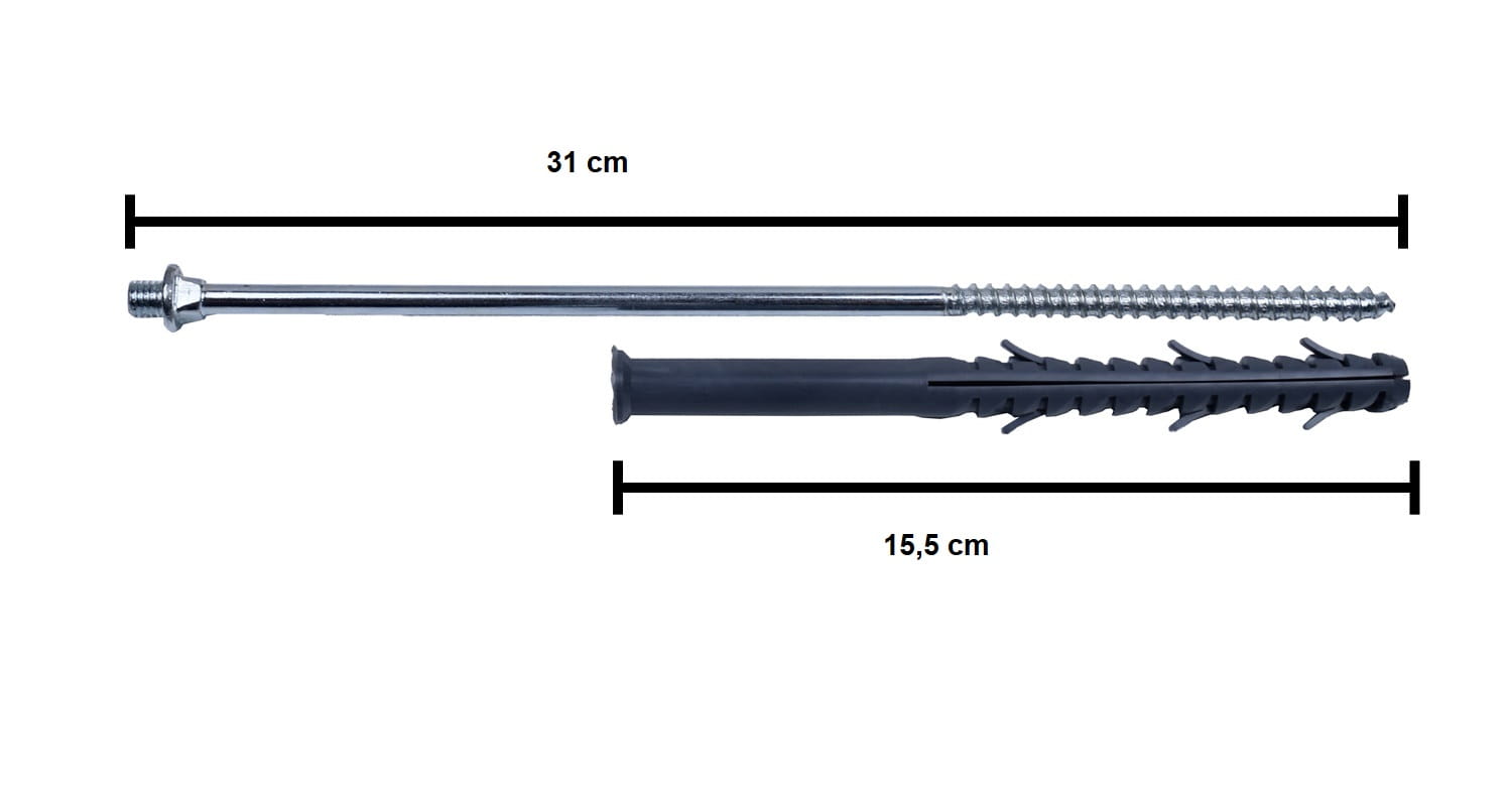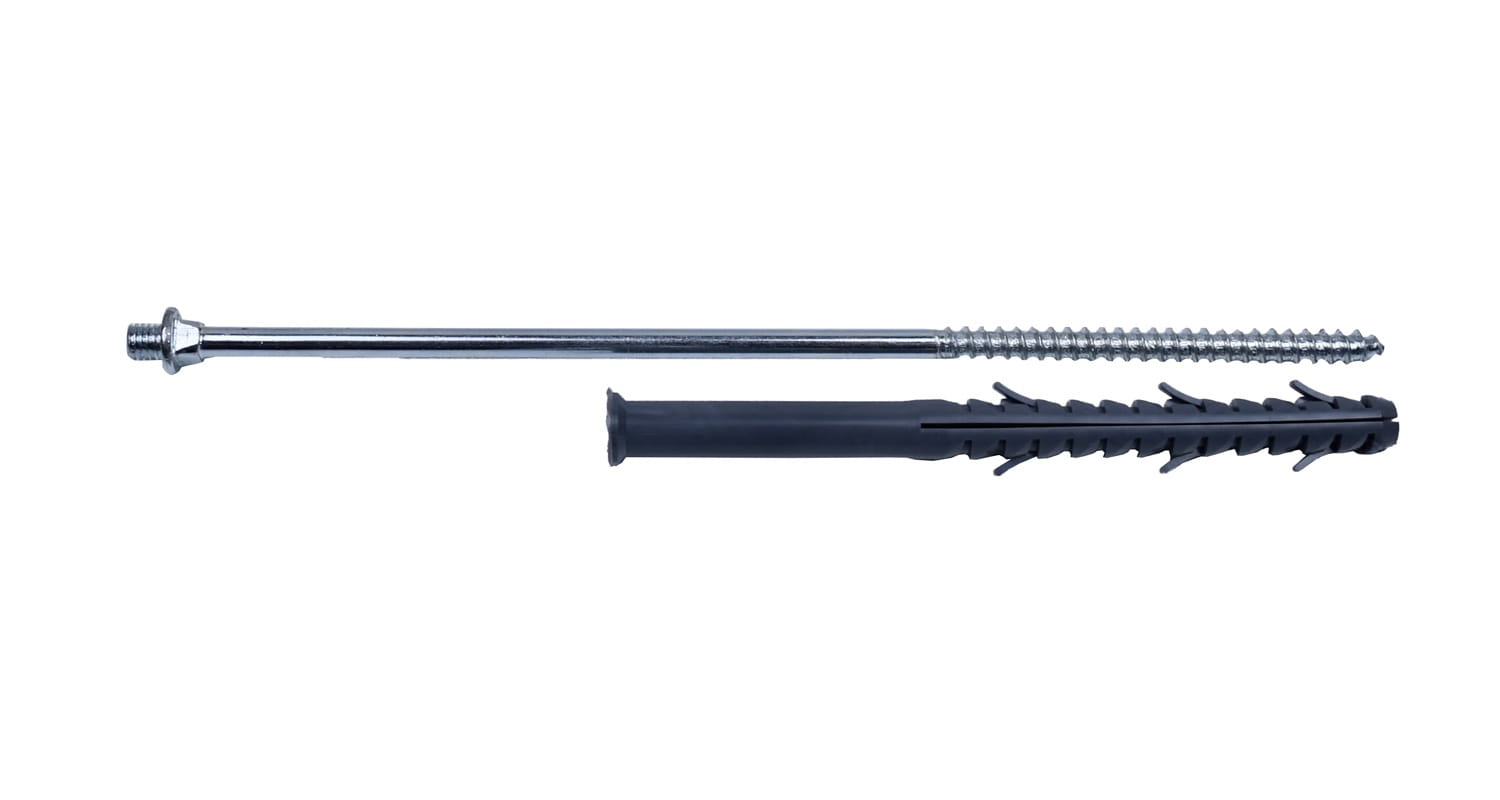 Śruba dwugwintowa zakończona z jednej strony standardowym gwintem metrycznym M8 a z drugiej wkrętem z kołkiem rozporowym